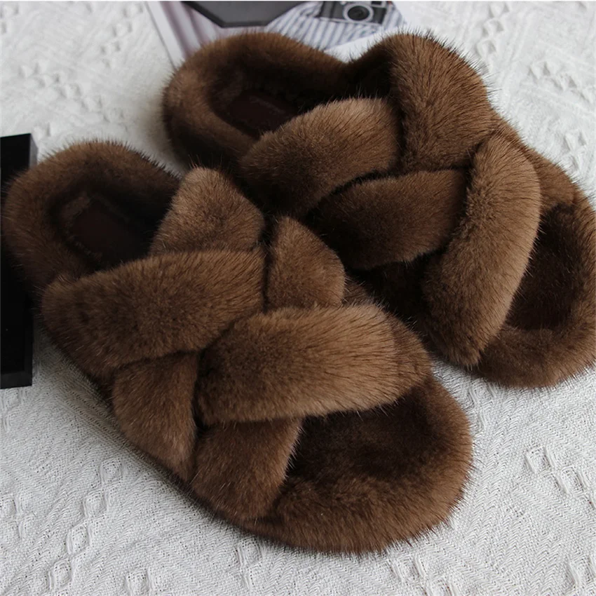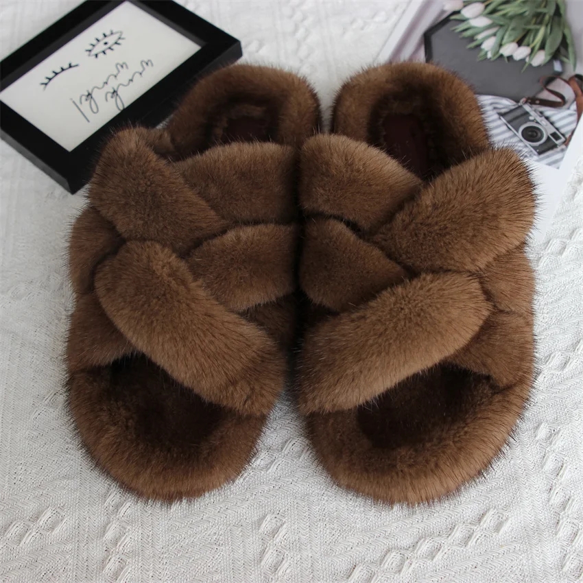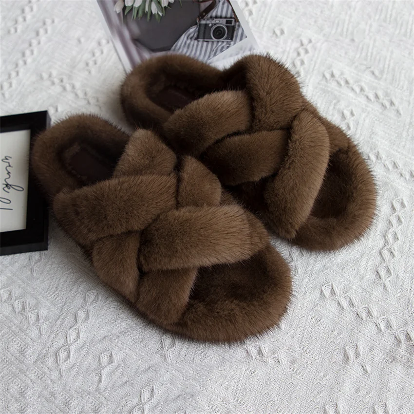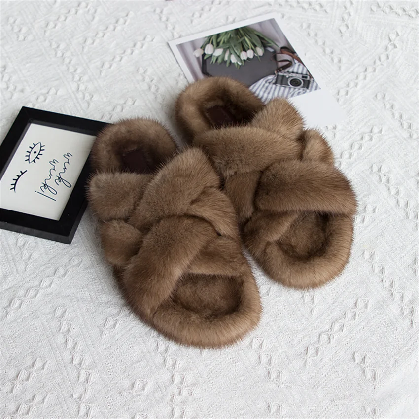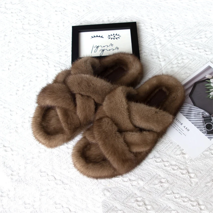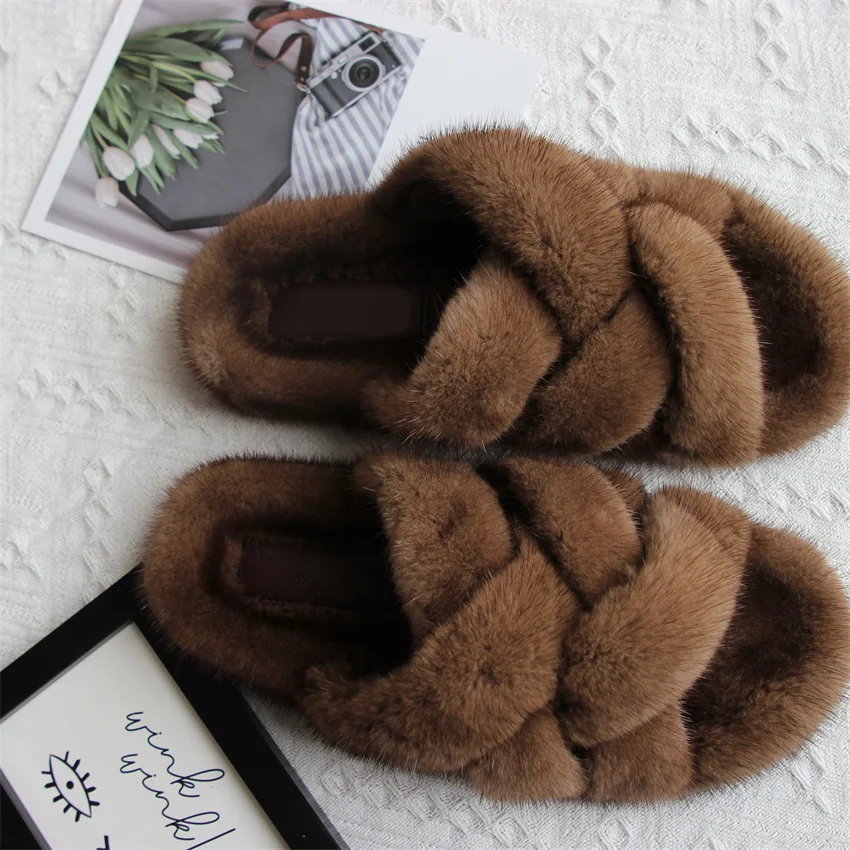 Zapatillas de piel de visón, zapatos para mujer, zapatillas de lujo para mujer, Zapatillas de piel 2024, chanclas para exteriores para mujer, sandalias para mujer