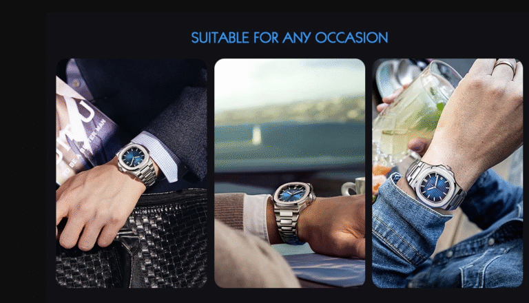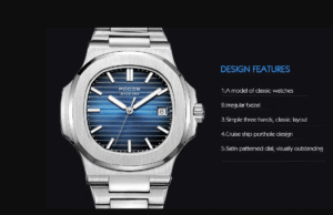 El elegante reloj deportivo: Esfera azul con relieve horizontal, con manecillas y marcadores de hora blancos que flotan sobre sus profundidades. Con el bisel octogonal redondeado, simple y limpio, pero sin caer en la moda, este innovador reloj desprendía una armonía interior muy agradable a la vista.
