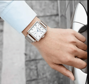 pareja con diamantes reales a la moda, reloj de mano mecánico con fecha