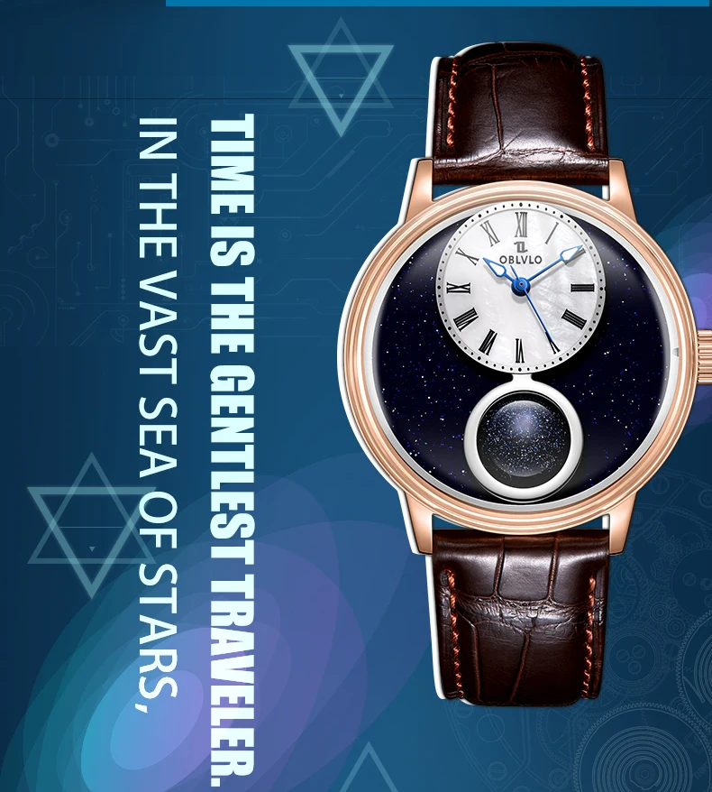OBLVLO Reloj mecánico automático retro de oro rosa para hombre con diseño de cielo estrellado Pantalla de 24 horas Correa de cuero Movimiento Miyota.