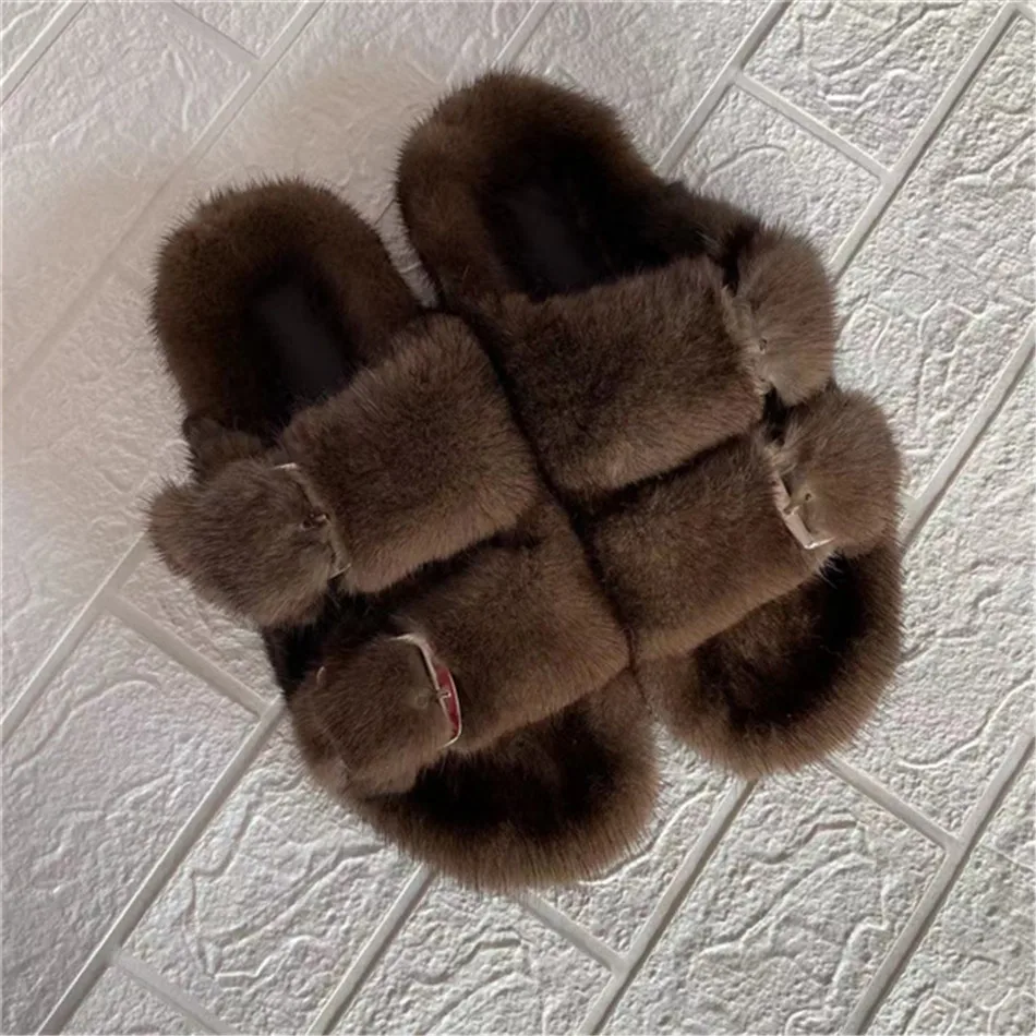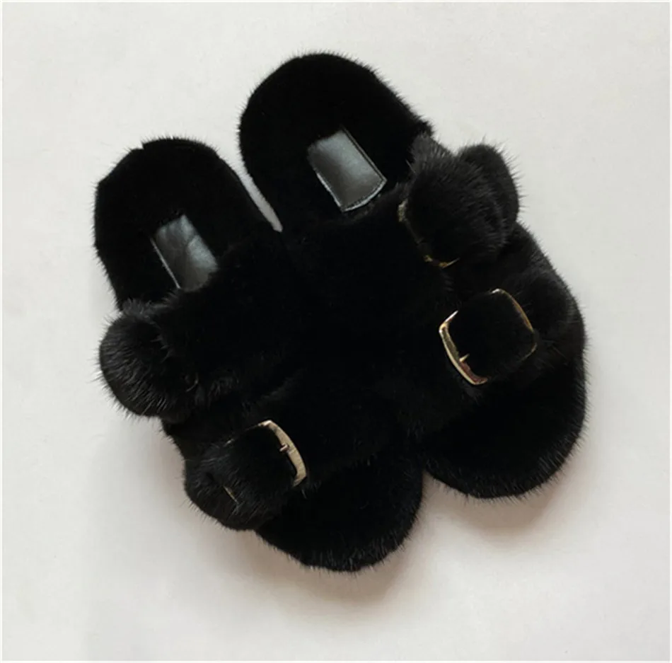 Zapatillas de piel para mujer, 100% zapatillas de piel de visón auténtica, estación europea